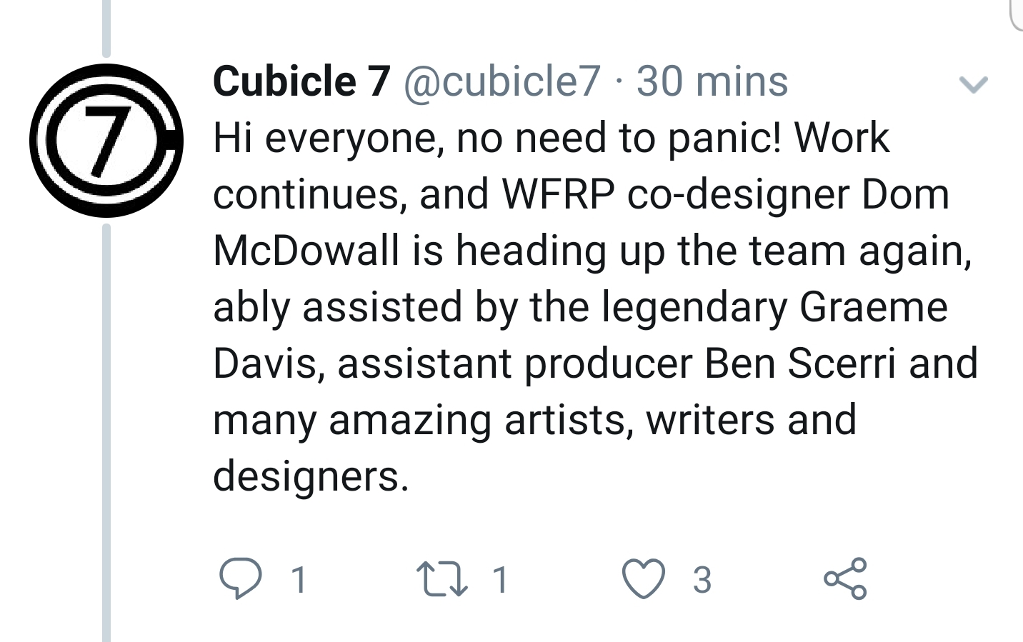 cubicle 7 isn't good at conveying when their products are going to release, and that's how they turn a profit! i don't expect them to say anything at all about this unless they absolutely have to and hope nobody notices the shakeup in any major circles. and i admit, i haven't seen any clue most people have.