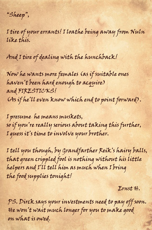 1: why does a coachman have a letter connecting his boss to the greenskins? that's blackmail material right there. anyone able to set this up should be self-aware enough not to leave something like that in the hands of a clown that mocks a big orc to his face.